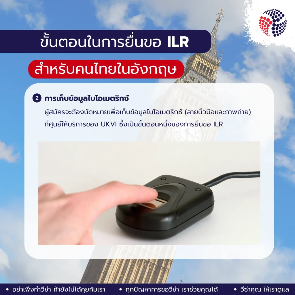 ผู้สมัครจะต้องนัดหมายเพื่อเก็บข้อมูลไบโอเมตริกซ์ (ลายนิ้วมือและภาพถ่าย) ที่ศูนย์ให้บริการของ UKVI ซึ่งเป็นขั้นตอนหนึ่งของการยื่นขอ ILR