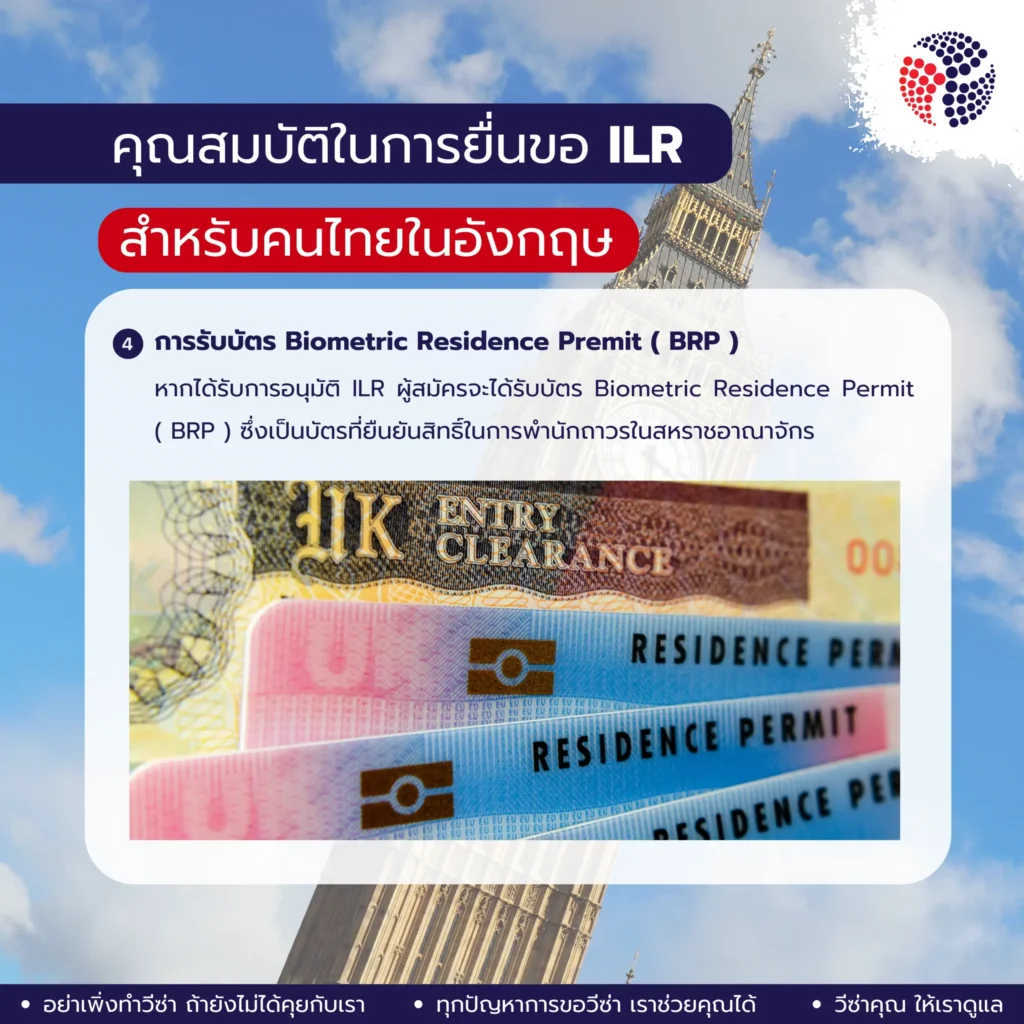 หากได้รับการอนุมัติ ILR ผู้สมัครจะได้รับบัตร Biometric Residence Permit (BRP) ซึ่งเป็นบัตรที่ยืนยันสิทธิ์ในการพำนักถาวรในสหราชอาณาจักร