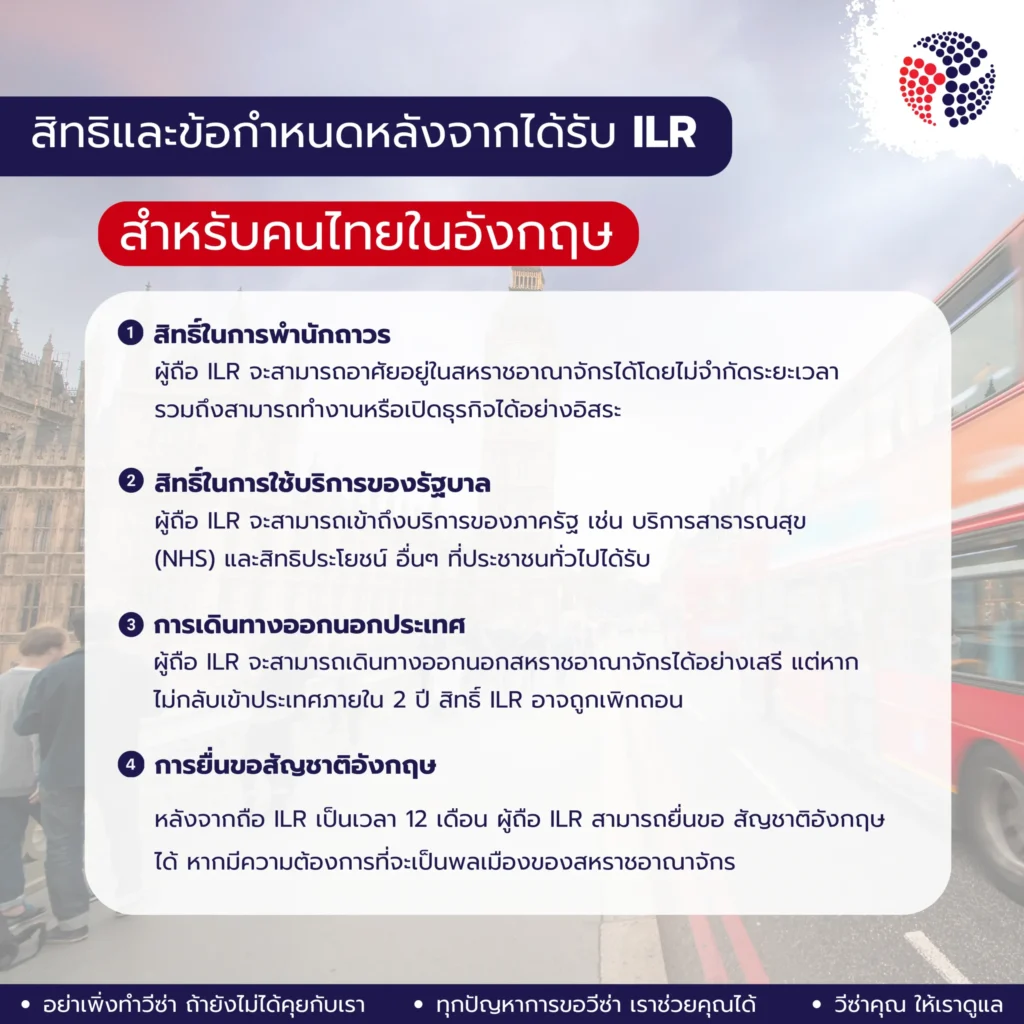 ผู้ถือ ILR จะสามารถอาศัยอยู่ในสหราชอาณาจักรได้โดยไม่จำกัดระยะเวลา รวมถึงสามารถทำงานหรือเปิดธุรกิจได้อย่างอิสระ