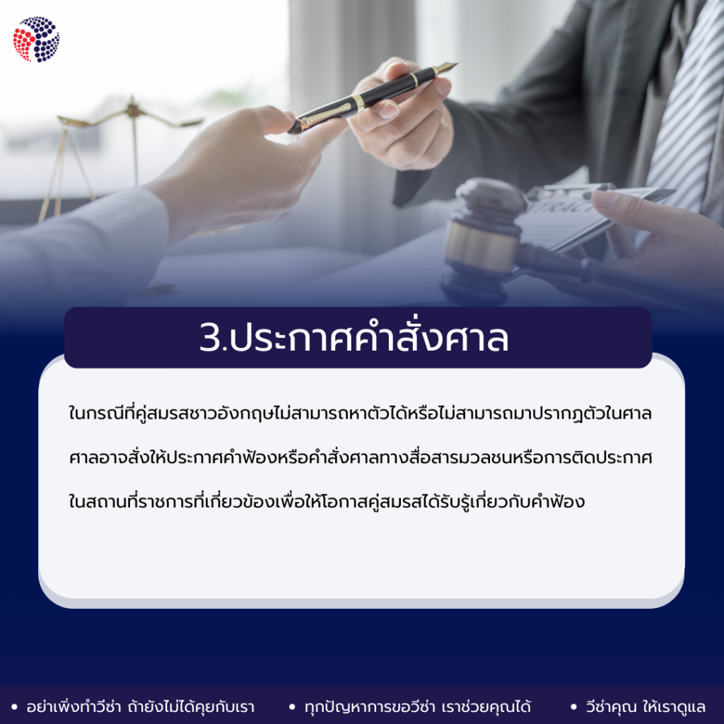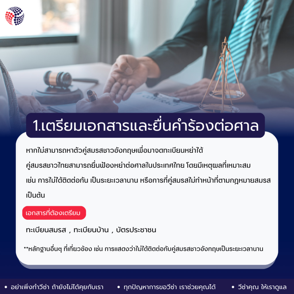 หากไม่สามารถหาตัวคู่สมรสชาวอังกฤษเพื่อมาจดทะเบียนหย่าได้ คู่สมรสชาวไทยสามารถยื่นฟ้องหย่าต่อศาลในประเทศไทย โดยมีเหตุผลที่เหมาะสม เช่น การไม่ได้ติดต่อกัน เป็นระยะเวลานาน หรือการที่คู่สมรสไม่ทำหน้าที่ตามกฎหมายสมรส เป็นต้น
