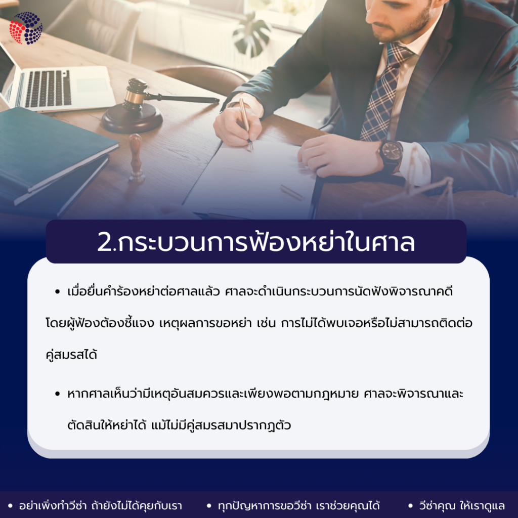 เมื่อยื่นคำร้องหย่าต่อศาลแล้ว ศาลจะดำเนินกระบวนการนัดฟังพิจารณาคดี โดยผู้ฟ้องต้องชี้แจง เหตุผลการขอหย่า เช่น การไม่ได้พบเจอหรือไม่สามารถติดต่อคู่สมรสได้ หากศาลเห็นว่ามีเหตุอันสมควรและเพียงพอตามกฎหมาย ศาลจะพิจารณาและตัดสินให้หย่าได้ แม้ไม่มีคู่สมรสมาปรากฏตัว