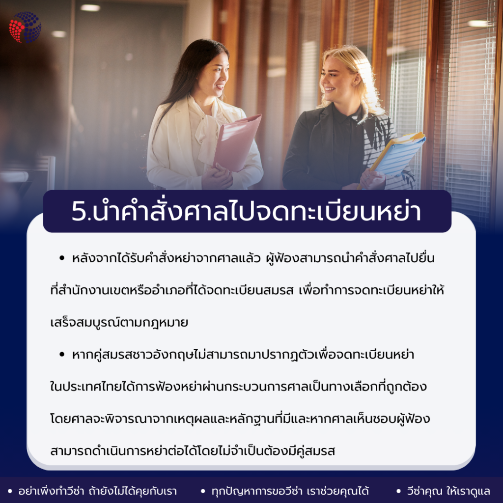 หลังจากได้รับคำสั่งหย่าจากศาลแล้ว ผู้ฟ้องสามารถนำคำสั่งศาลไปยื่น ที่สำนักงานเขตหรืออำเภอที่ได้จดทะเบียนสมรส เพื่อทำการจดทะเบียนหย่าให้ เสร็จสมบูรณ์ตามกฎหมาย หากคู่สมรสชาวอังกฤษไม่สามารถมาปรากฏตัวเพื่อจดทะเบียนหย่า ในประเทศไทยได้การฟ้องหย่าผ่านกระบวนการศาลเป็นทางเลือกที่ถูกต้อง โดยศาลจะพิจารณาจากเหตุผลและหลักฐานที่มีและหากศาลเห็นชอบผู้ฟ้อง สามารถดำเนินการหย่าต่อได้โดยไม่จำเป็นต้องมีคู่สมรส
