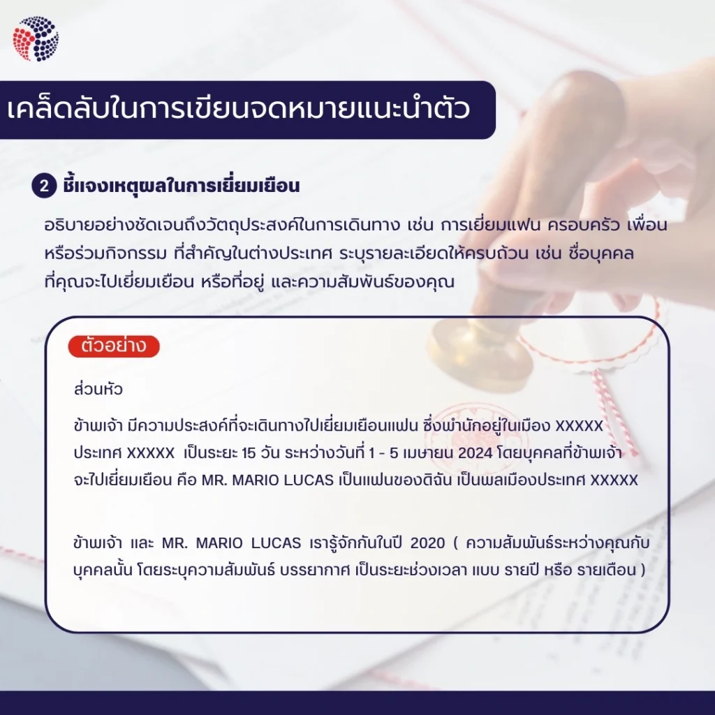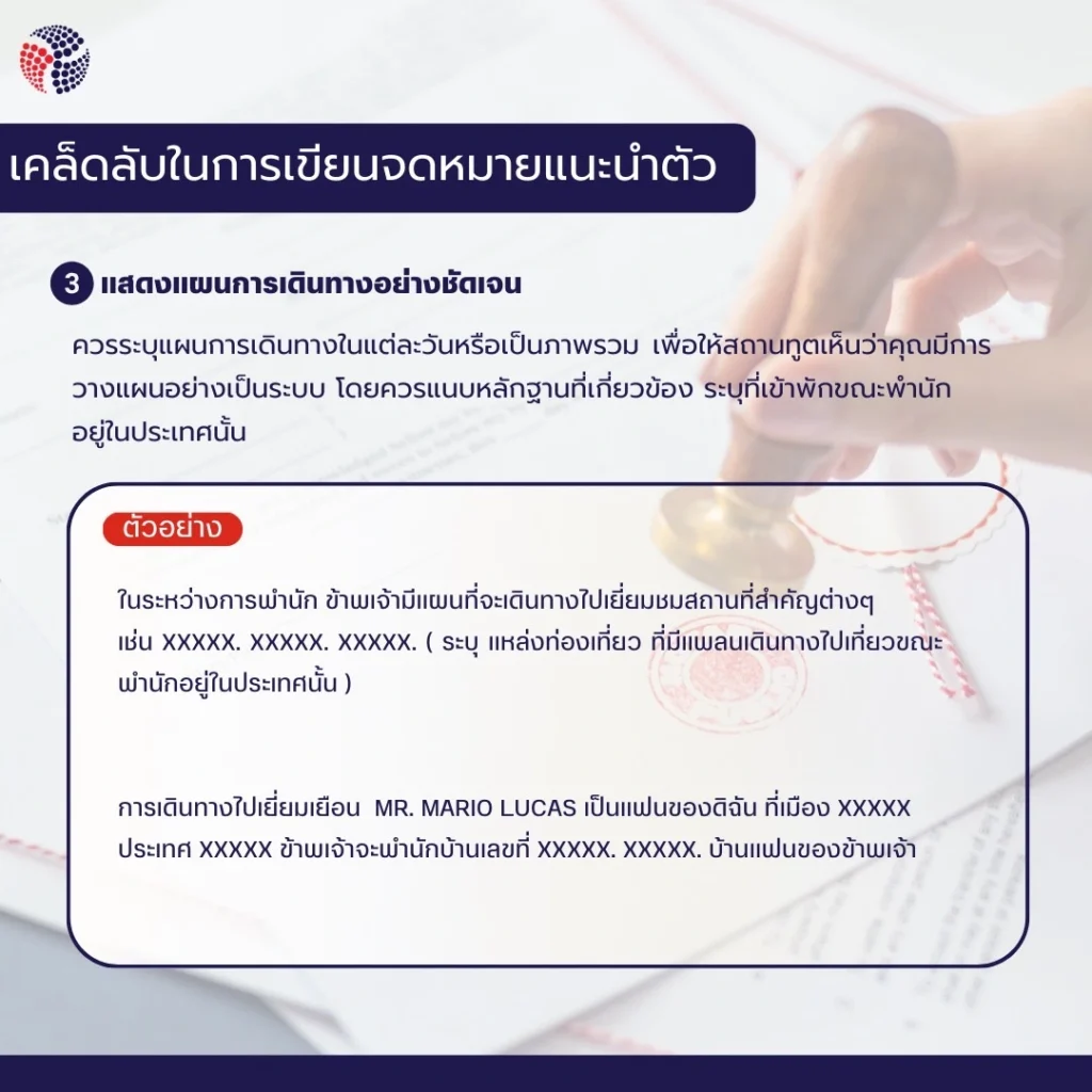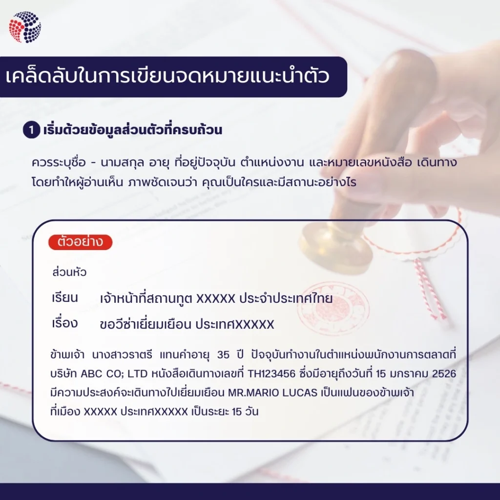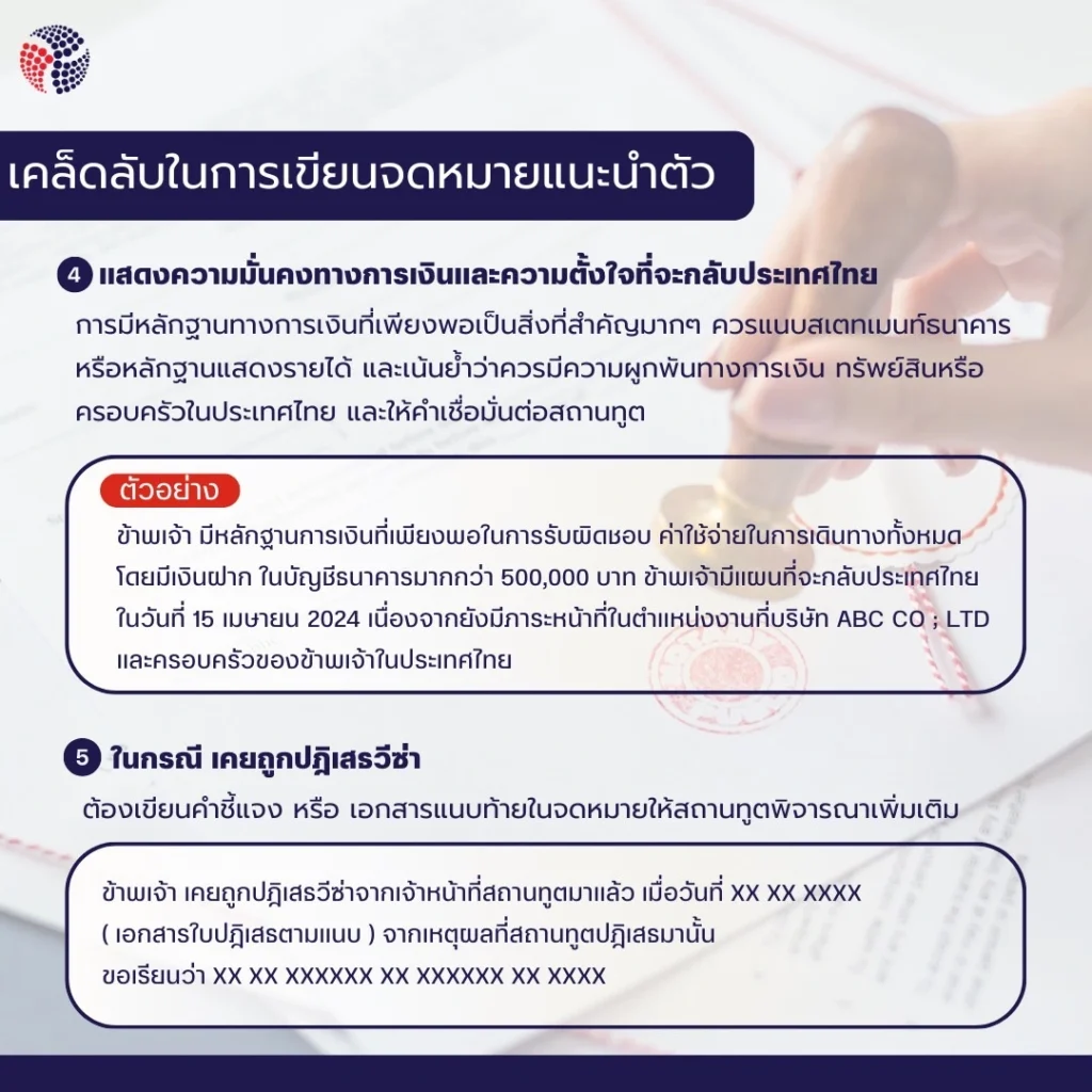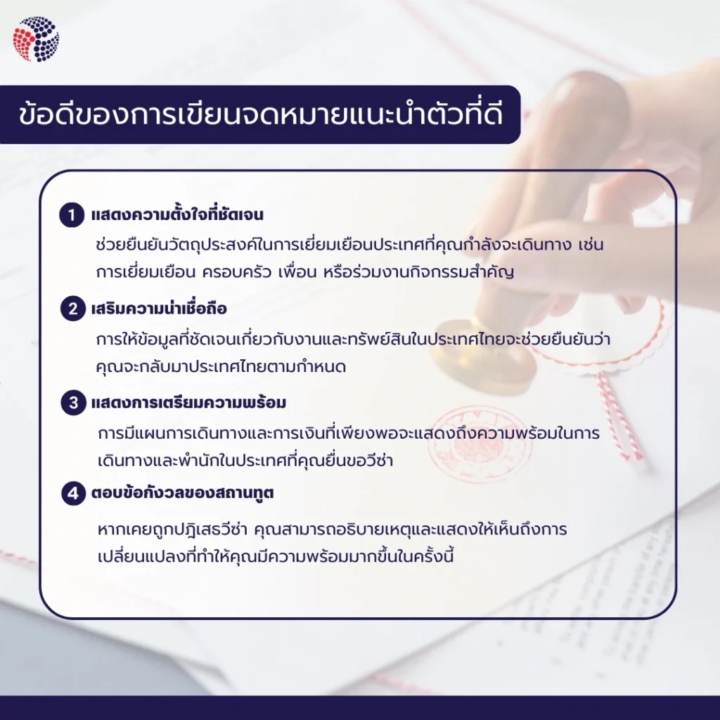 การเขียนจดหมายแนะนำตัวในการยื่นขอวีซ่านั้นไม่เพียงแต่เป็นการบอกข้อมูลทั่วไปเกี่ยวกับตัวคุณ แต่ยังเป็นโอกาสที่คุณจะสามารถอธิบายเจตนารมณ์และความตั้งใจที่ชัดเจนได้จดหมายไม่ควรมีแค่ภาษาไทย ควรเขียนแปลเป็นภาษาอังกฤษด้วย เพื่อง่ายต่อการเข้าใจในตัวผู้สมัครโดยเฉพาะอย่างยิ่งสำหรับผู้ที่เคยถูกปฏิเสธวิซ่าหรือมีโอกาสสูงที่จะถูกปฏิเสธ การเขียนจดหมายที่ดี สามารถเพิ่มความมั่นใจและความน่าเชื่อถือให้กับสถานทูตได้