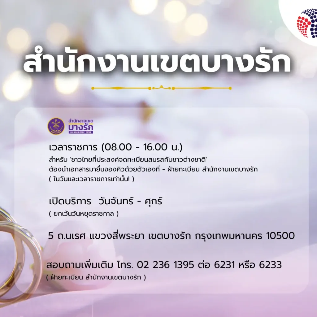 - สอบถามเพิ่มเติม โทร. 02 236 1395 ต่อ 6231 หรือ 6233 ( ฝ่ายทะเบียน สำนักงานเขตบางรัก )
