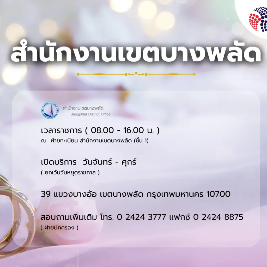 - เวลาราชการ ( 08.00 - 16.00 น. ) ณ ฝ่ายทะเบียน สำนักงานเขตบางพลัด (ชั้น 1)