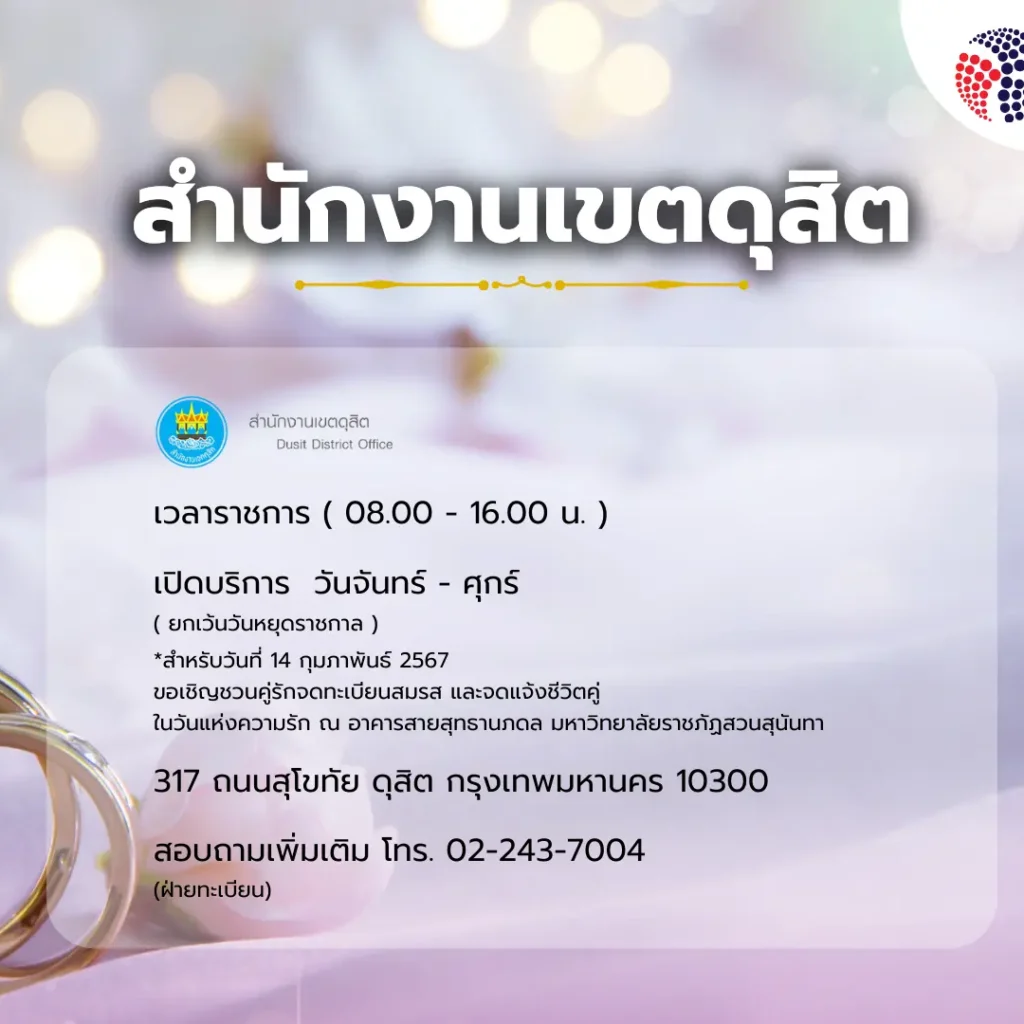 - สำหรับวันที่ 14 กุมภาพันธ์ 2567 ขอเชิญชวนคู่รักจดทะเบียนสมรส และจดแจ้งชีวิตคู่ในวันแห่งความรัก