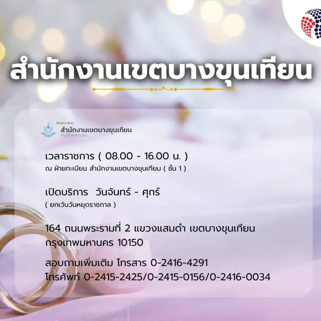- เวลาราชการ ( 08.00 - 16.00 น. ) ณ ฝ่ายทะเบียน สำนักงานเขตบางขุนเทียน ( ชั้น 1 )
