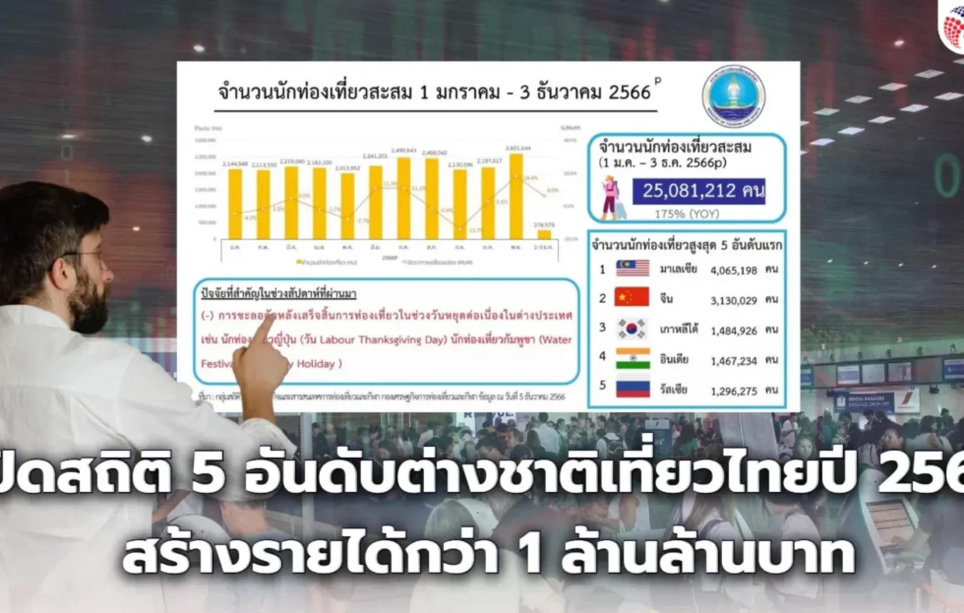 เปิดสถิติ 5 อันดับต่างชาติเที่ยวไทยปี 2566 สร้างรายได้กว่า 1 ล้านล้านบาท